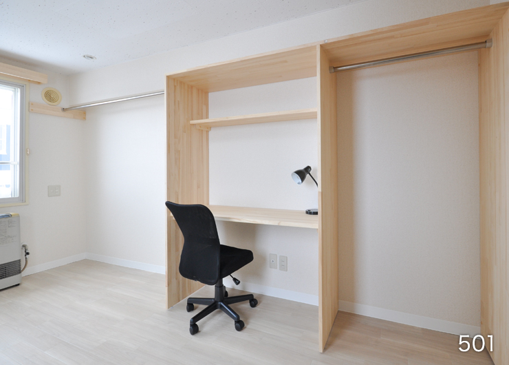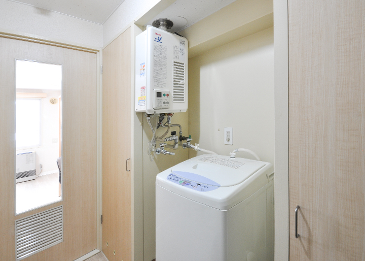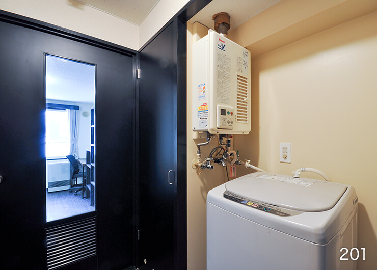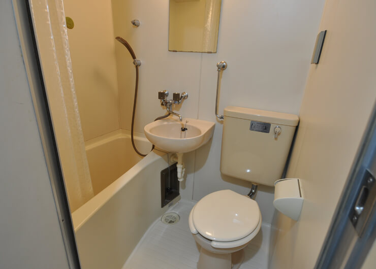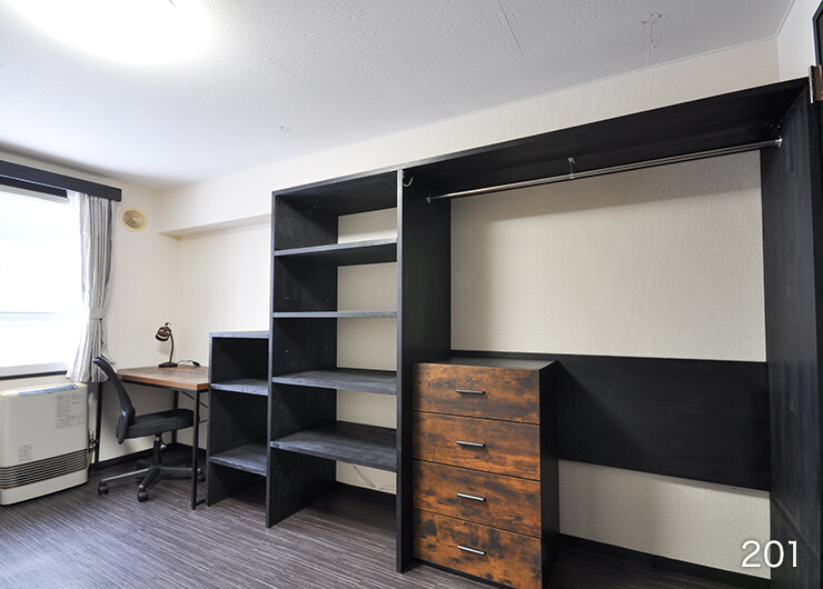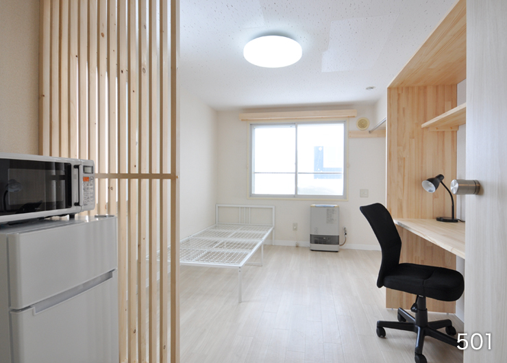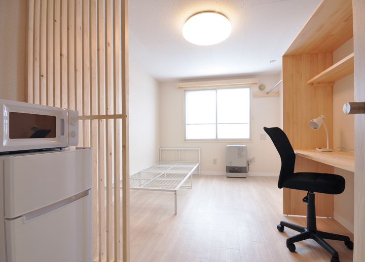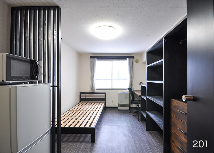 | 各室設備 | 机、椅子、電気スタンド、ベッド・ベッドマット、カーテン、ユニットバス、ガスFF暖房(LPガス)、ガス給湯(LPガス)、照明、洗濯機、冷蔵庫、電子レンジ、1口電気コンロ、収納、BS対応、フレッツ光(無料) |